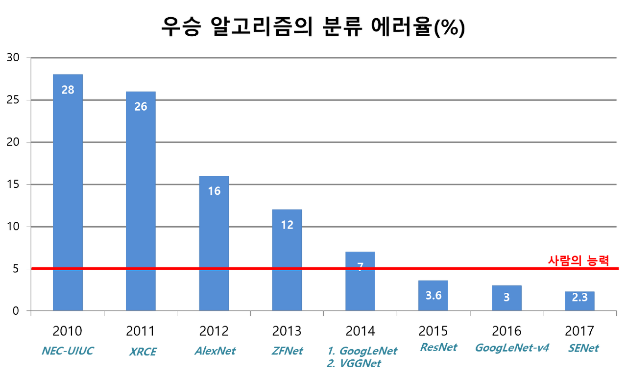 사람이 직접 이미지를 분류하였을 때 오답을 낼 확률은 5%였습니다. 과거 인공지능은 사람보다 낮은 성과를 내었지만, 최근 딥러닝의 빠른 발전으로 인하여 사람의 능력을 뛰어넘은 AI가 탄생하고 있습니다.